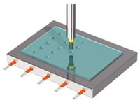 穴加工されたテープの穴のバリを熱治具で除去します。変形量の小さい金属を均熱加熱し、加工穴に入れ熱除去します。