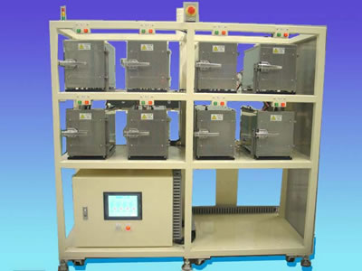 小型加熱炉をラックに8 台並べてそれぞれに単独制御できるシステムを組み込んでいます。
